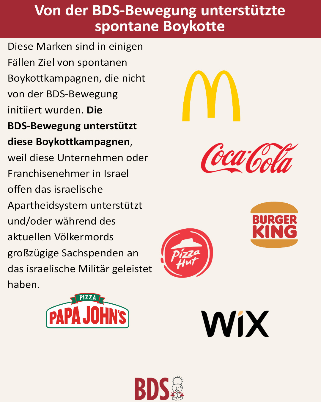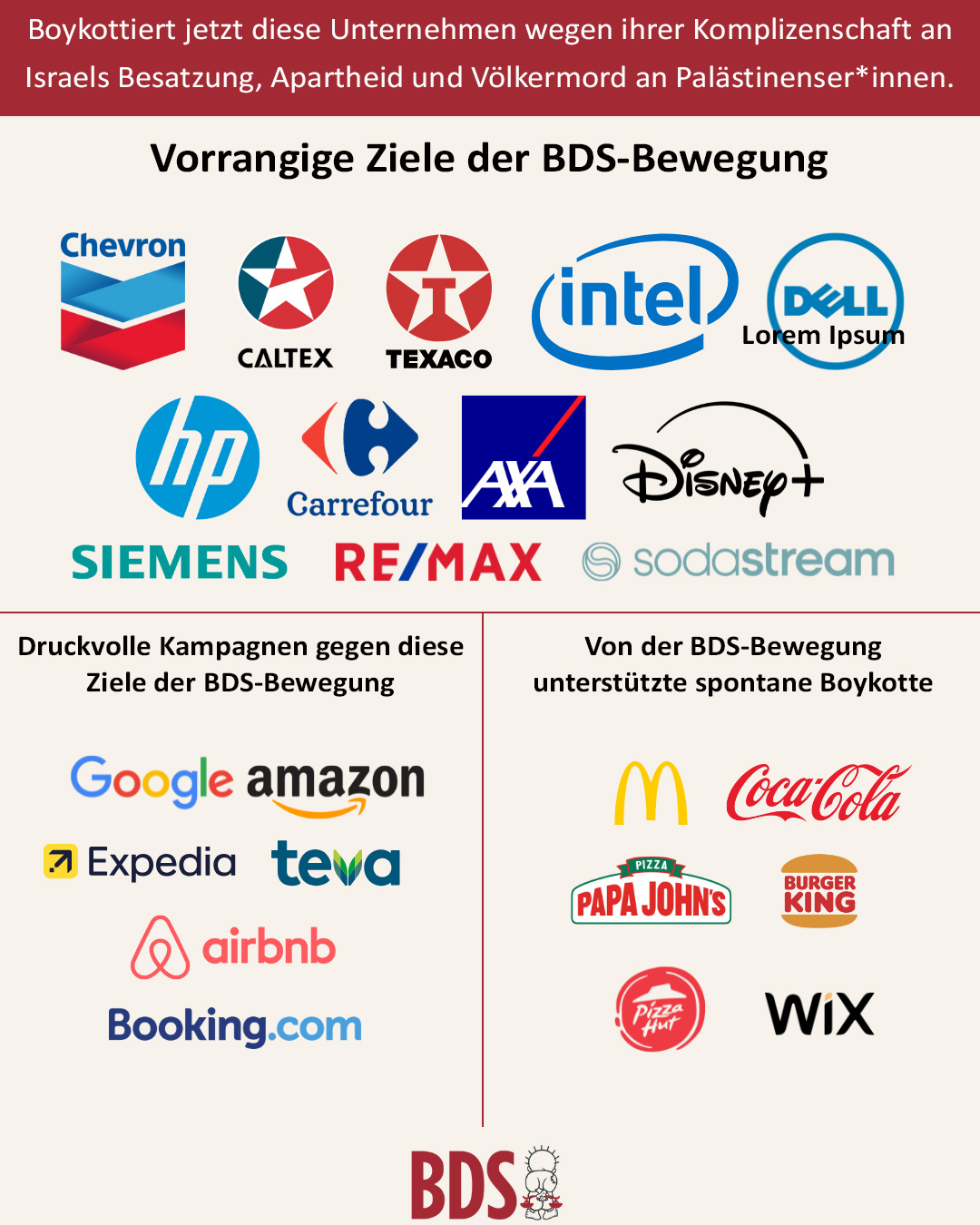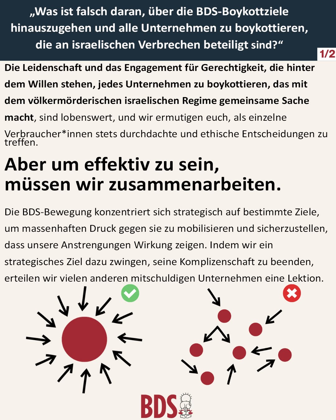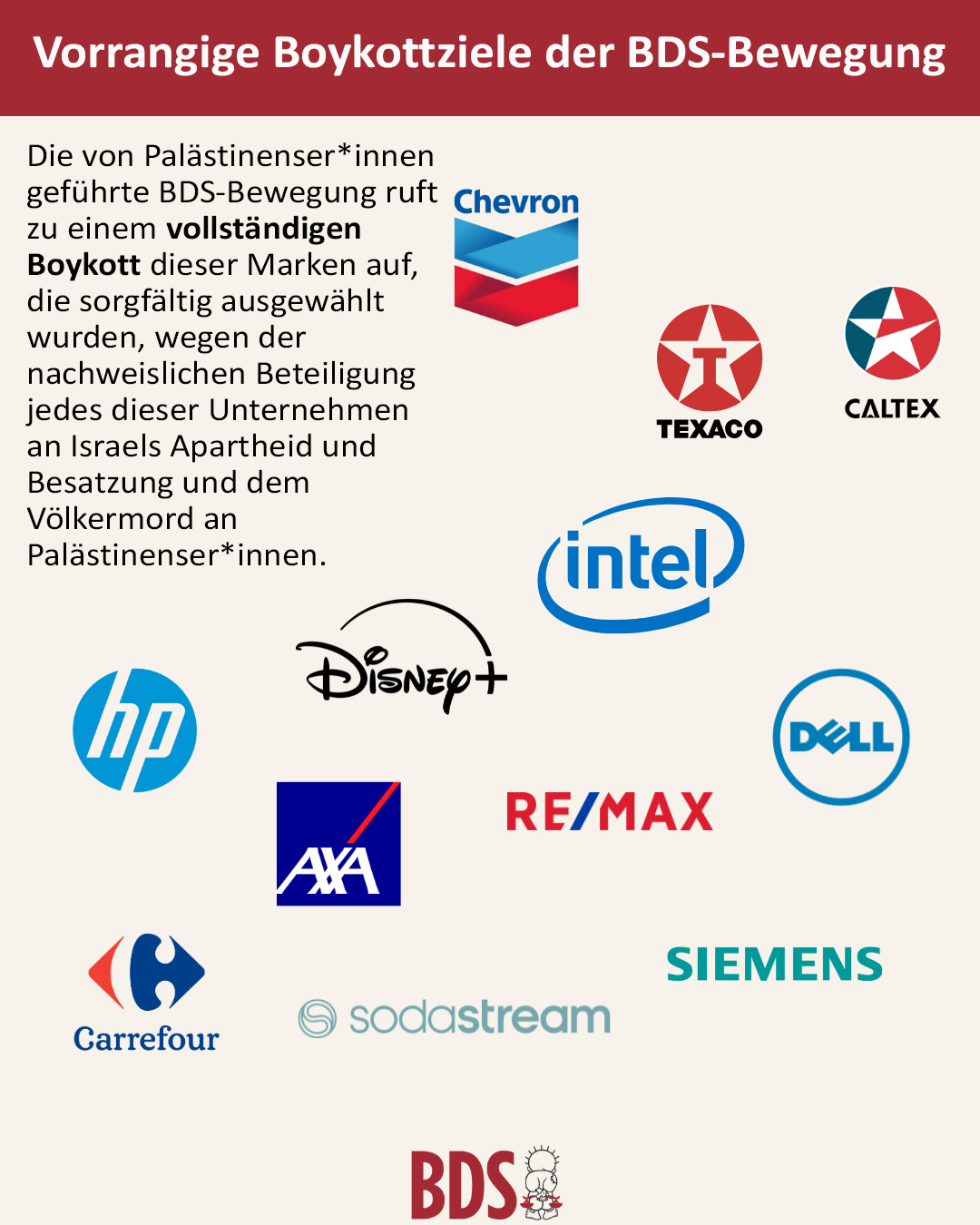 Die BDS-Bewegung hat ihre vorrangigen Ziele, druckvollen Kampagnen gegen entsprechende Ziele und Ziele für spontane Kampagnen aktualisiert. Boykottiert diese Unternehmen und übt Druck auf sie aus, denn sie sind an Israels Besatzung und Apartheid sowie seinem vom IGH für plausibel erachteten Völkermord an der indigenen palästinensischen Bevölkerung beteiligt. Die Beendigung jeglicher Komplizenschaft von Regierungen, Unternehmen und Institutionen mit Israel ist dringender denn je. Beteiligung an Unterdrückung zu beenden ist heute und für immer eine moralische Verpflichtung!