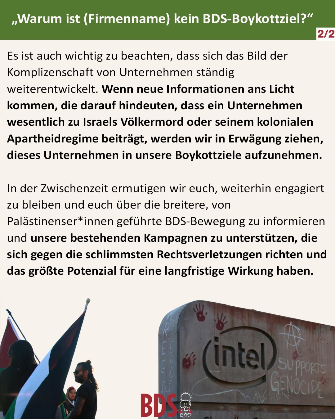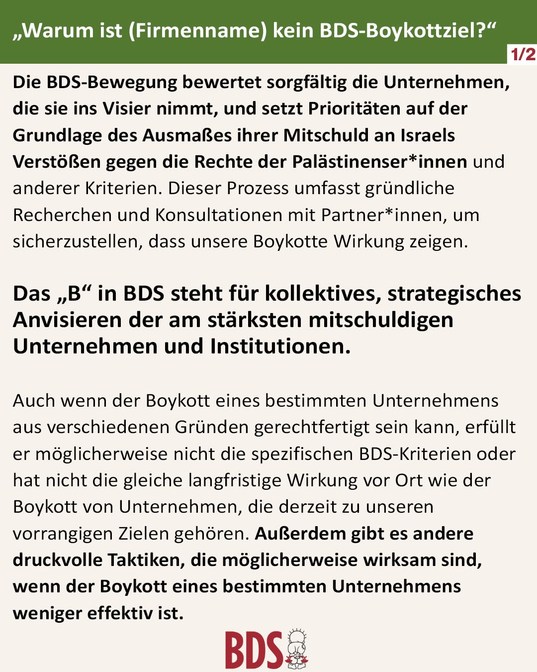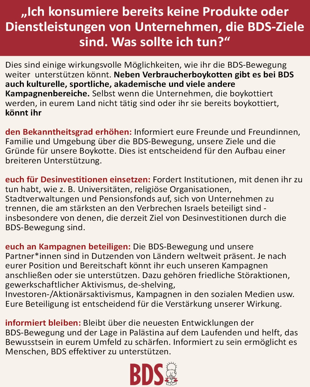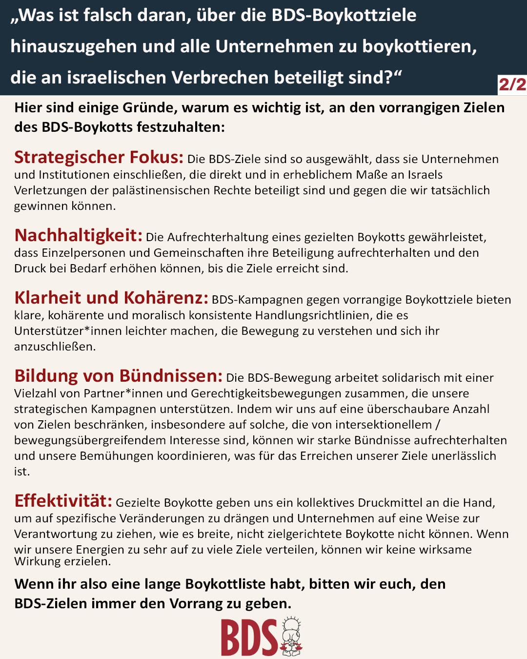 Die BDS-Bewegung hat ihre vorrangigen Ziele, druckvollen Kampagnen gegen entsprechende Ziele und Ziele für spontane Kampagnen aktualisiert. Boykottiert diese Unternehmen und übt Druck auf sie aus, denn sie sind an Israels Besatzung und Apartheid sowie seinem vom IGH für plausibel erachteten Völkermord an der indigenen palästinensischen Bevölkerung beteiligt. Die Beendigung jeglicher Komplizenschaft von Regierungen, Unternehmen und Institutionen mit Israel ist dringender denn je. Beteiligung an Unterdrückung zu beenden ist heute und für immer eine moralische Verpflichtung!