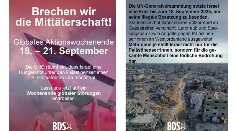 🚨um vom 18. bis 21. September eine massive Störungsbewegung gegen die Komplizenschaft bei Israels Völkermord an den Palästinenser*innen zu erreichen.