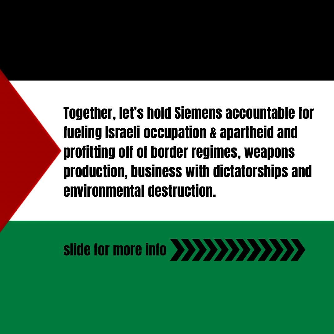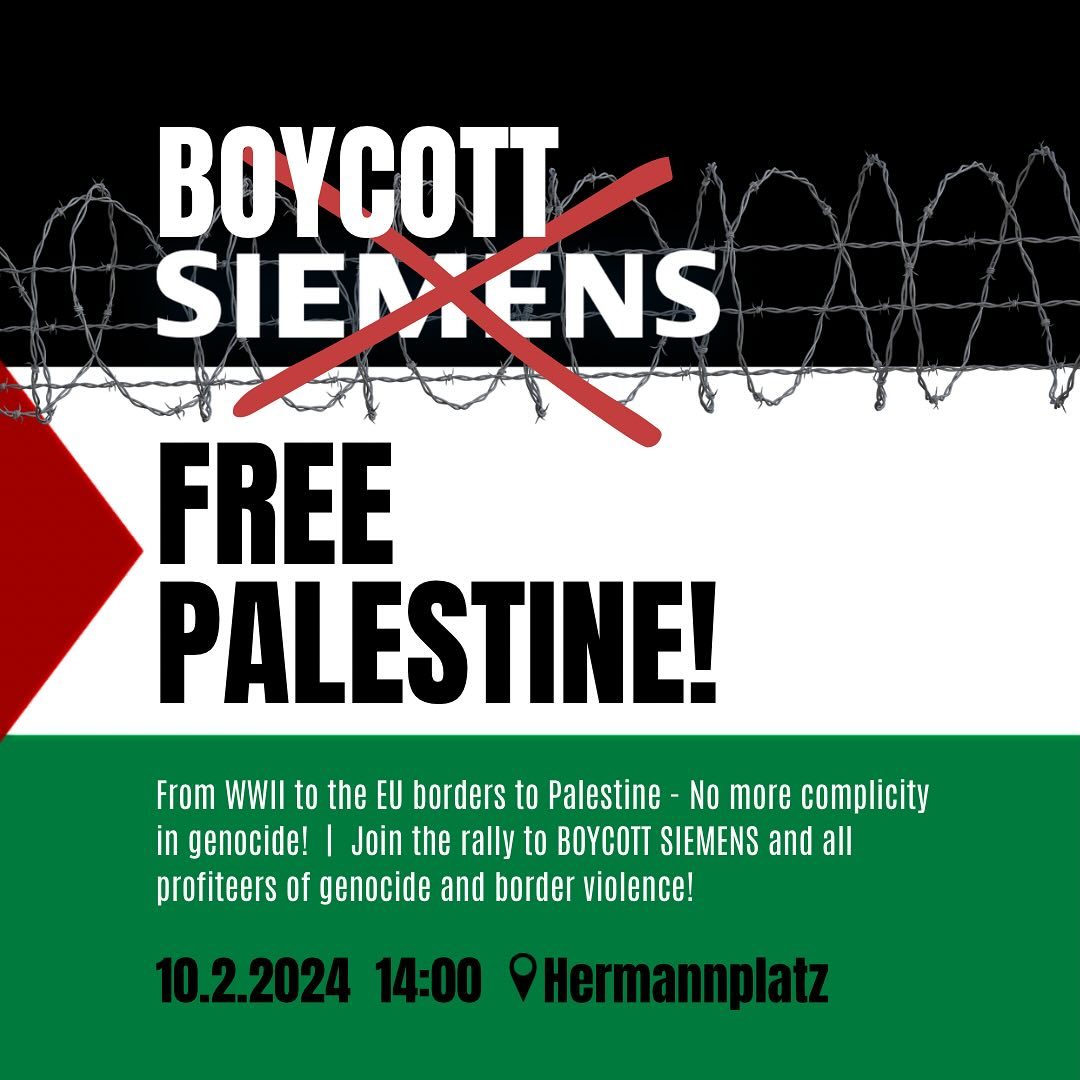 Beteiligt euch an der Kampagne zum BOYCOTT von SIEMENS und allen Profiteuren von Völkermord und Grenzgewalt! Lasst uns gemeinsam Siemens dafür zur Rechenschaft ziehen, dass es an der israelischen Besatzung und Apartheid beteiligt ist und von Grenzregimen, Waffenproduktion und Umweltzerstörung profitiert.