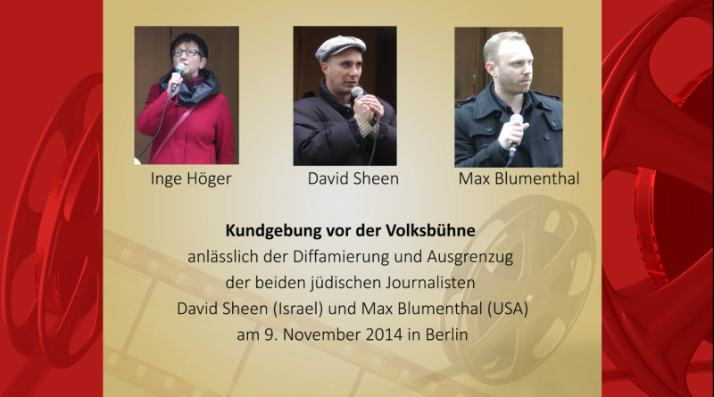 Kundgebung vor der Volksbühne am 9. November 2014 anlässlich der Diffamierung und Ausgrenzug der beiden jüdischen Journalisten David Sheen (Israel) und Max Blumenthal (USA) am 9. November 2014 in Berlin.