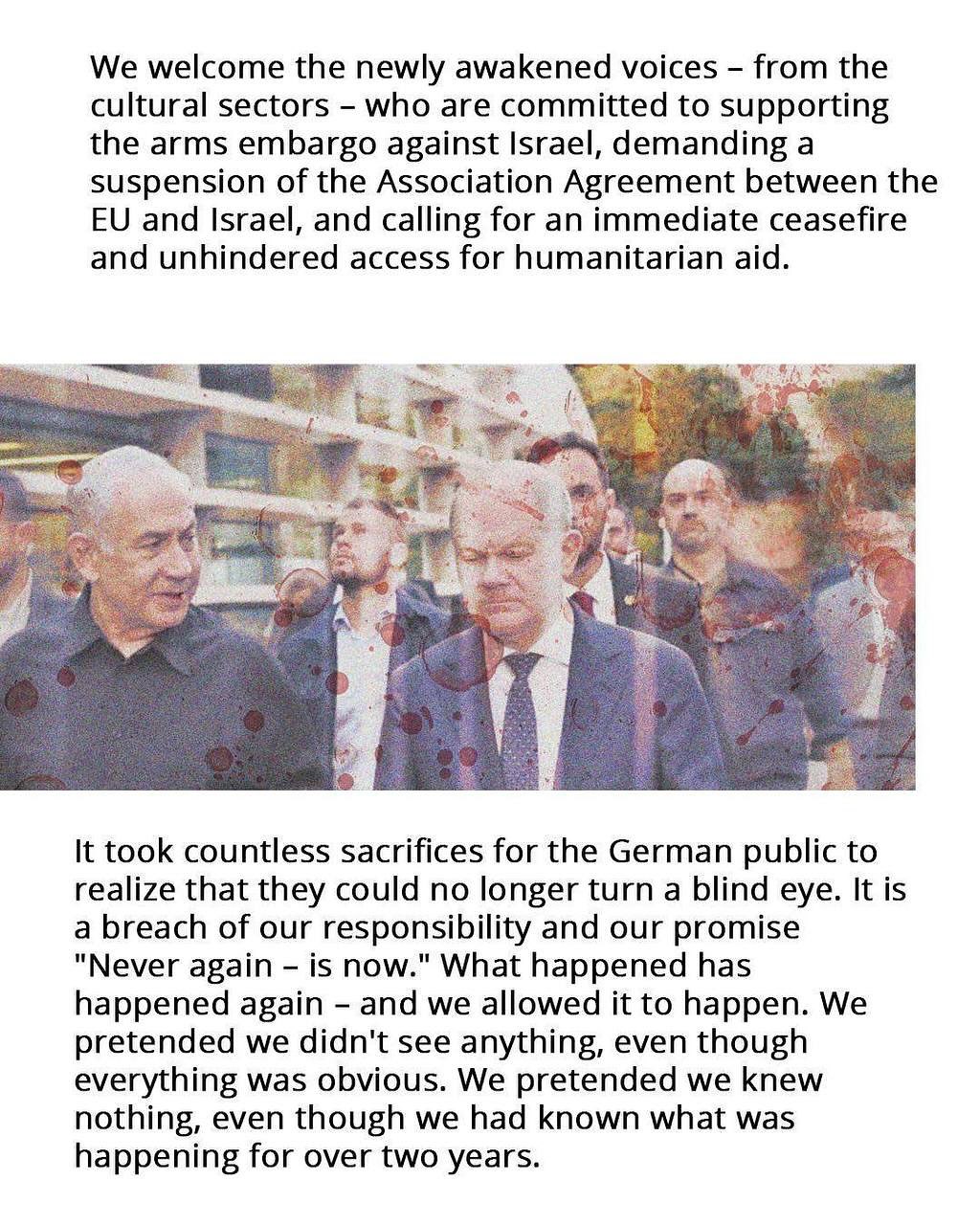 Wir begrüßen die neu erwachten Stimmen – aus Kulturschaffenden Bereichen – , die sich in Deutschland dafür einsetzen, das Waffenembargo gegen Israel zu unterstützen, ein Aussetzen des Assoziierungsabkommens zwischen der EU und Israel verlangen sowie einen sofortigen Waffenstillstand und ungehinderten Zugang für humanitäre Hilfe fordern.