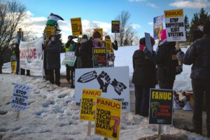 Aktivist*innen protestierten vor einer FANUC-Fabrik und riefen ihre Forderungen.