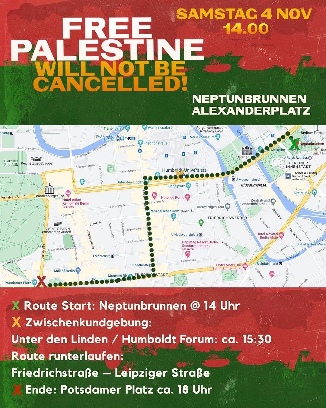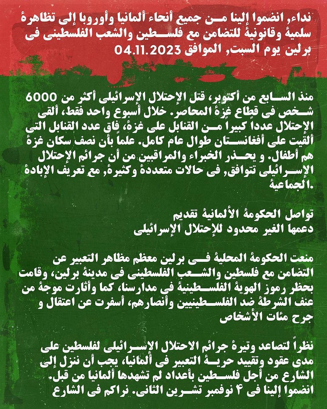 Wir rufen Menschen aus ganz Deutschland und Europa auf, am 4. November 2023 zu einer friedlichen und legalen Demonstration in Solidarität mit Palästina nach Berlin zu kommen.
