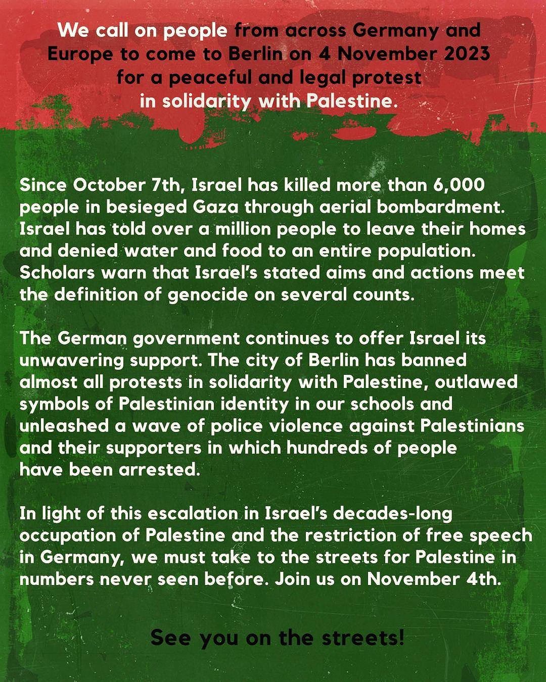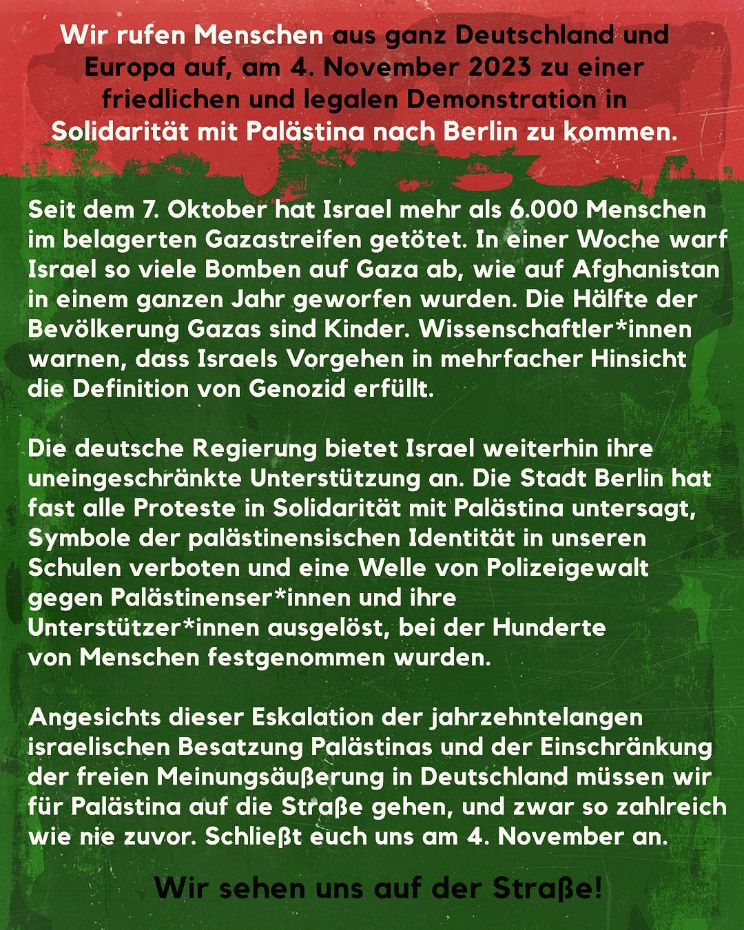 Angesichts dieser Eskalation der jahrzehntelangen israelischen Besatzung Palästinas und der Einschränkung der freien Meinungsäußerung in Deutschland müssen wir für Palästina auf die Straße gehen, und zwar so zahlreich wie nie zuvor. Schließt euch uns am 4. November an. Wir sehen uns auf der Straße!