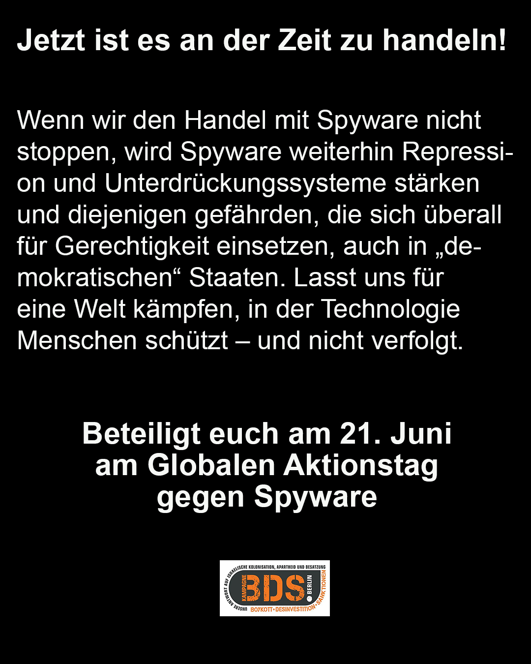 SpywareWeltweiter Aktionstag 21. Juni 2025: Globaler Aktionstag gegen Spyware! 21. Juni 2025 #BanSpyware, #IsraelOutofMyPhone