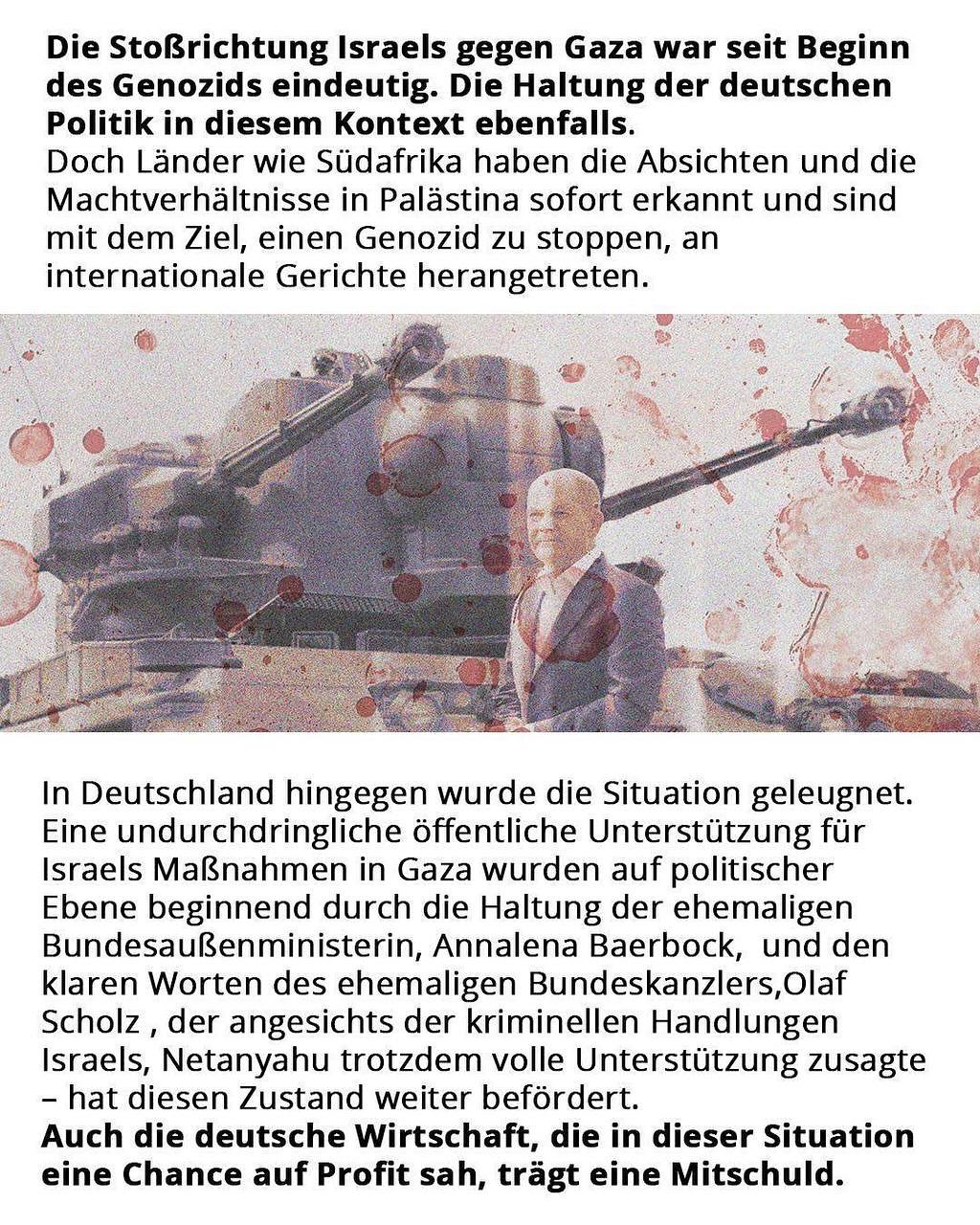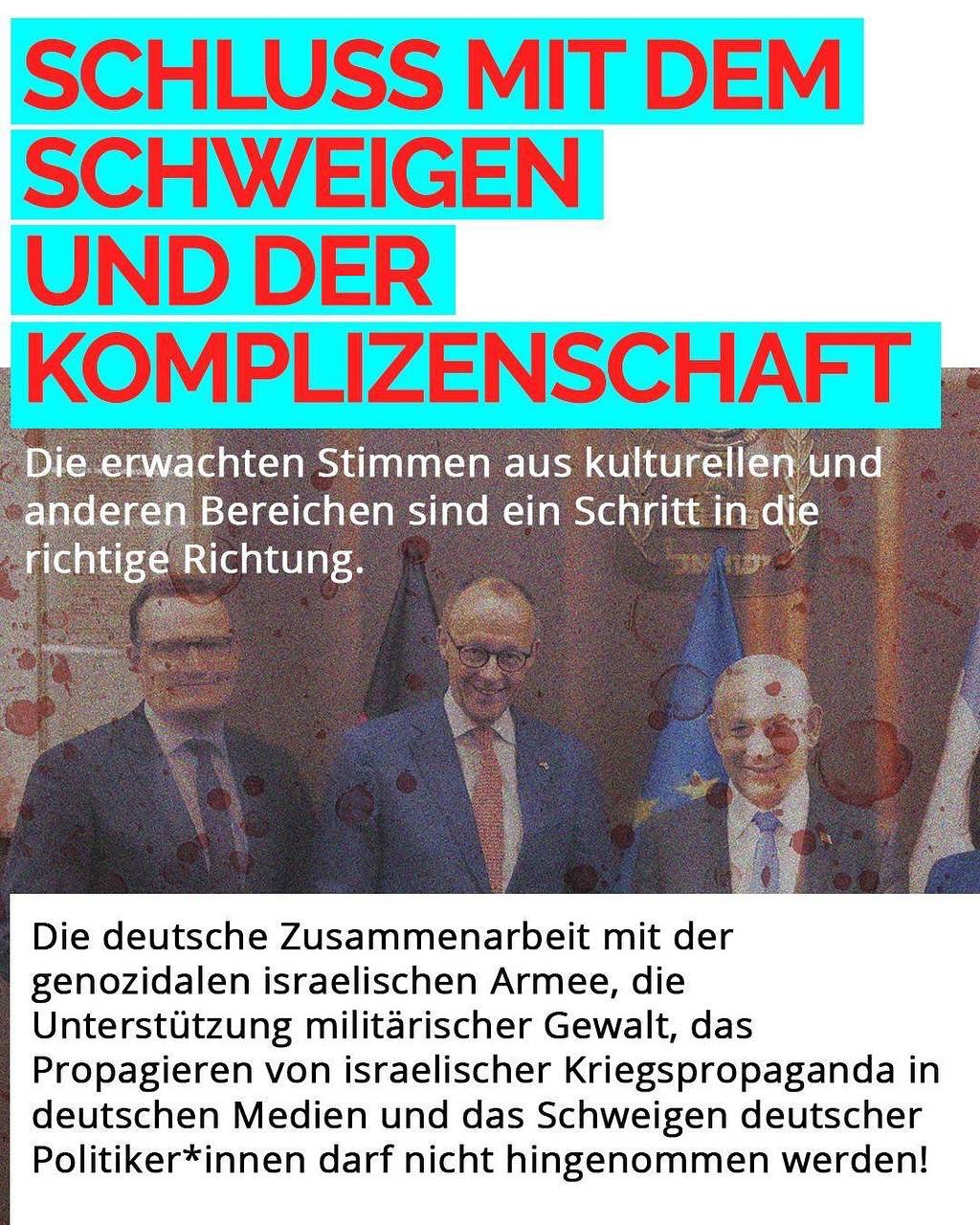 Die deutsche Zusammenarbeit mit der genozidalen israelischen Armee, die Unterstützung militärischer Gewalt, das Propagieren von israelischer Kriegspropaganda in deutschen Medien und das Schweigen deutscher Politiker*innen darf nicht hingenommen werden.
