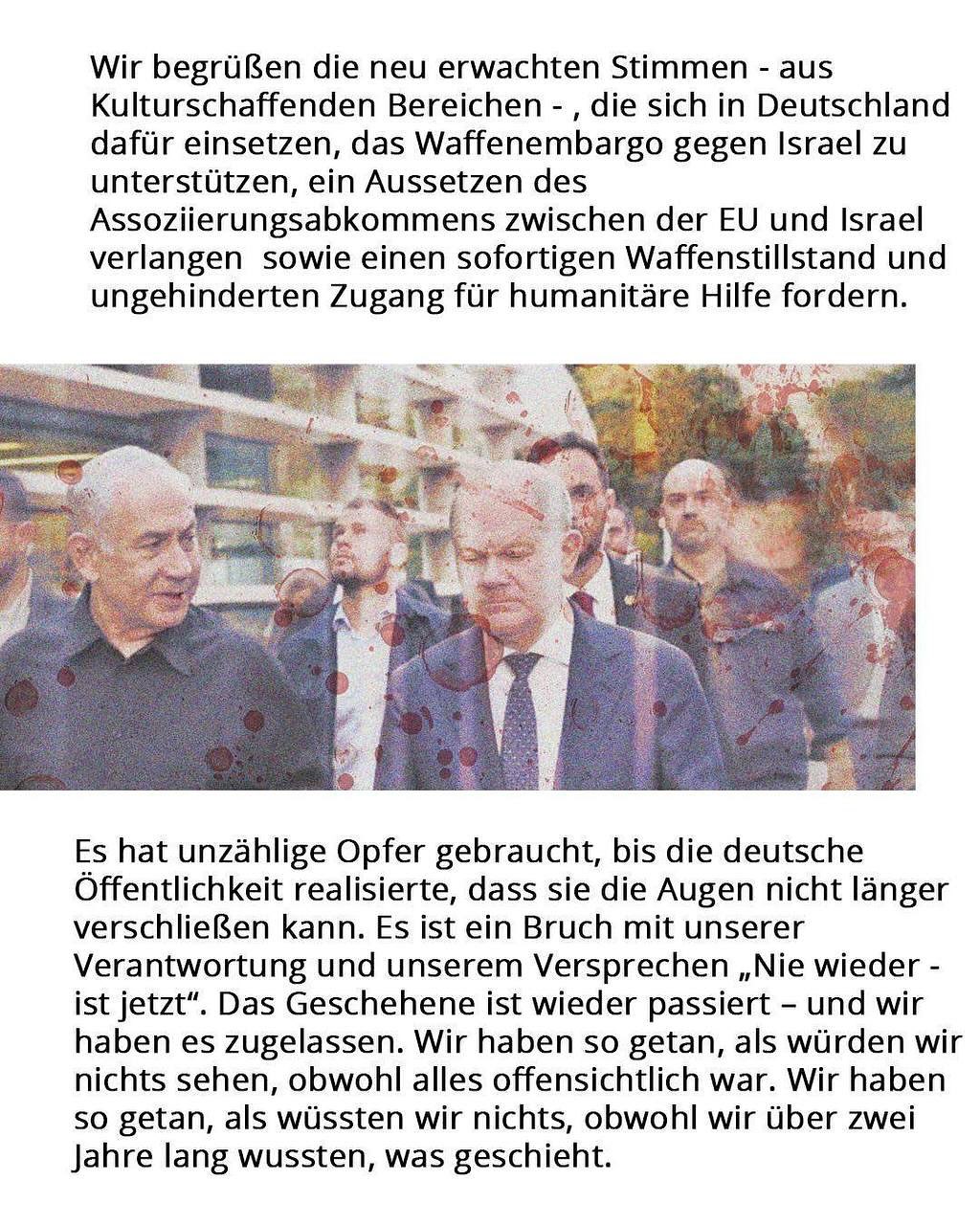 Wir begrüßen die neu erwachten Stimmen – aus Kulturschaffenden Bereichen – , die sich in Deutschland dafür einsetzen, das Waffenembargo gegen Israel zu unterstützen, ein Aussetzen des Assoziierungsabkommens zwischen der EU und Israel verlangen sowie einen sofortigen Waffenstillstand und ungehinderten Zugang für humanitäre Hilfe fordern.