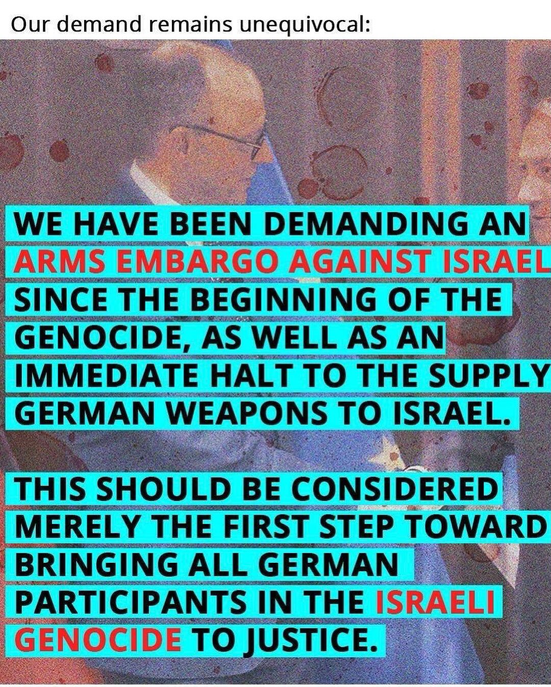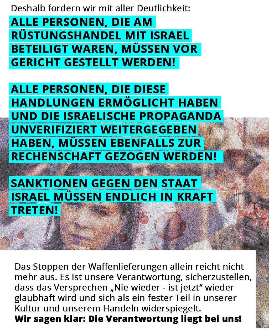Deshalb fordern wir mit aller Deutlichkeit: Alle Personen, die am Rüstungshandel mit Israel beteiligt waren, müssen vor Gericht gestellt werden. Alle Personen, die diese Handlungen ermöglicht haben und die israelische Propaganda unverifiziert weitergegeben haben, müssen ebenfalls zur Rechenschaft gezogen werden. Sanktionen gegen den Staat Israel müssen endlich in Kraft treten.